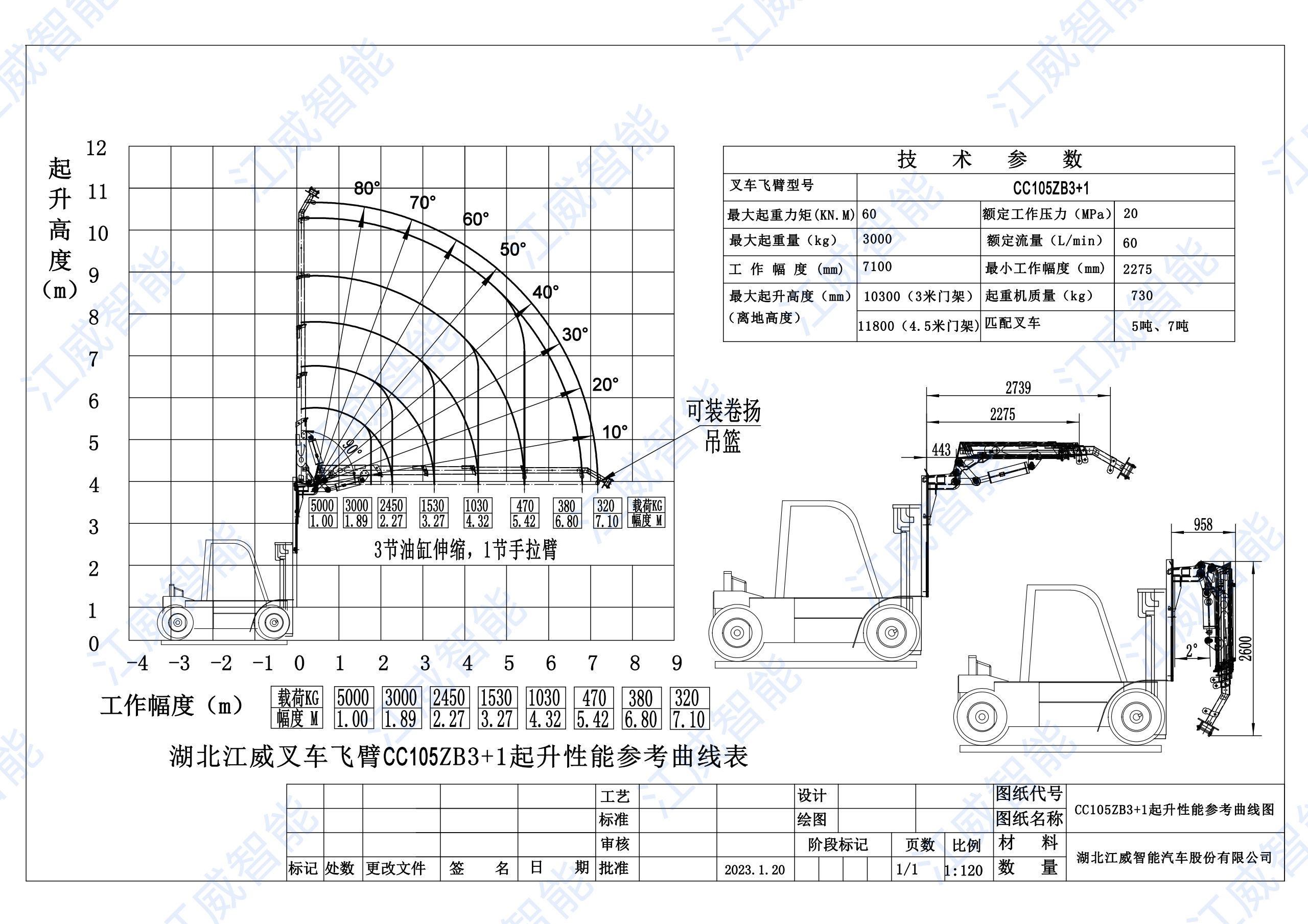 江威5噸飛臂吊(CC105),3節(jié)液壓一節(jié)手拉臂帶彎頭副臂,最大工作半徑7.1米,不出臂吊3噸,全部升出吊300多公斤,建議配在4.5噸或4.5噸以上的叉車上,如果只需要高度也可以配3.5噸叉車,加叉車門架高度3米最大起升高度10.5米。