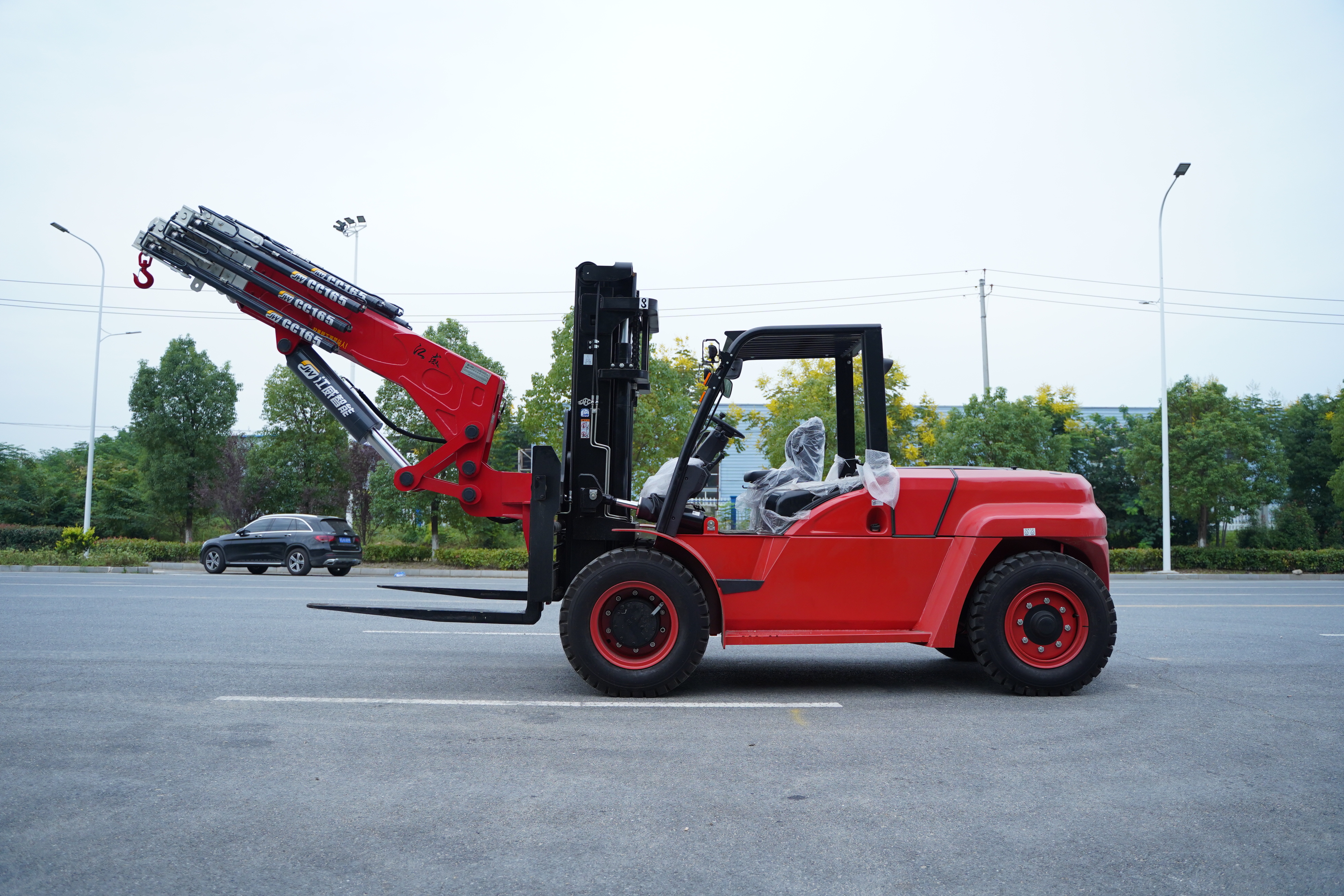 很多地下室限高,吊車進(jìn)不去,一些機(jī)器吊裝,搬運(yùn),就只能用叉車了,配上吊臂,能叉能吊,工作起來(lái)很是得勁兒。