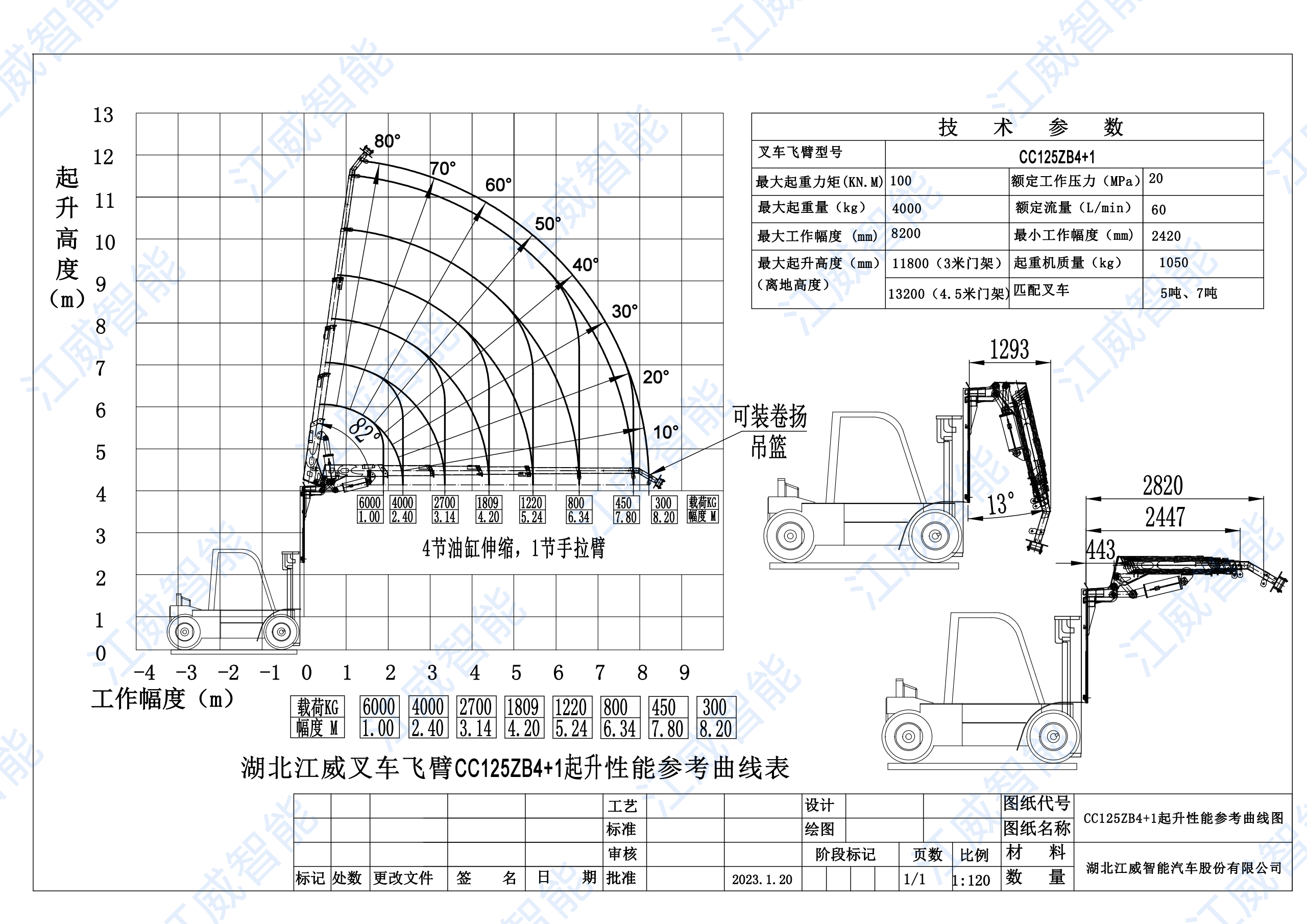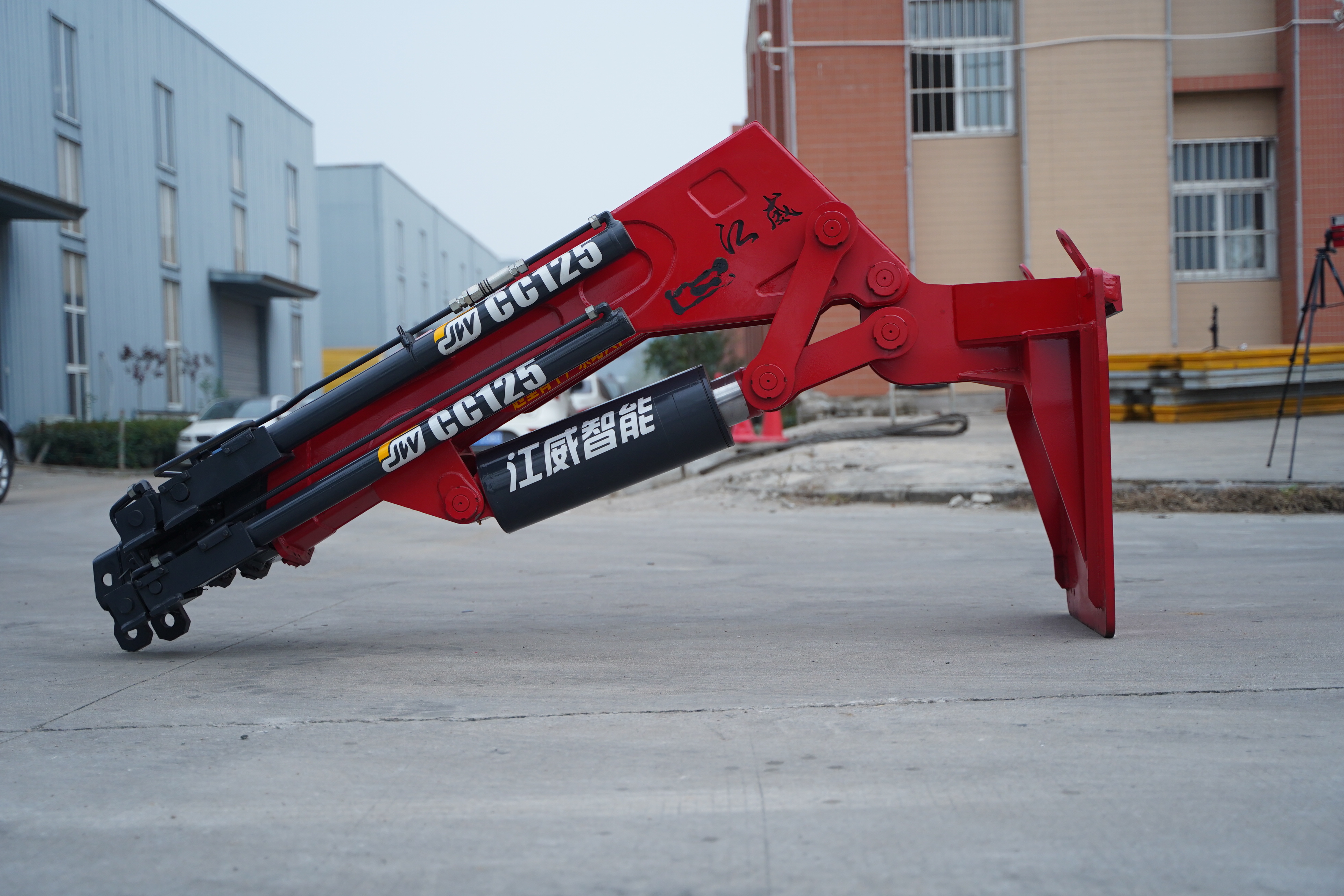 江威6噸飛臂吊(CC125),4節(jié)液壓一節(jié)手拉臂帶彎頭副臂,最大工作半徑8.2米,不出臂吊4.5噸,全部升出吊300多公斤,建議配在5噸或5噸以上的叉車上,如果只需要高度也可以配3.5噸叉車,加叉車門架高度3米最大起升高度11.7米。