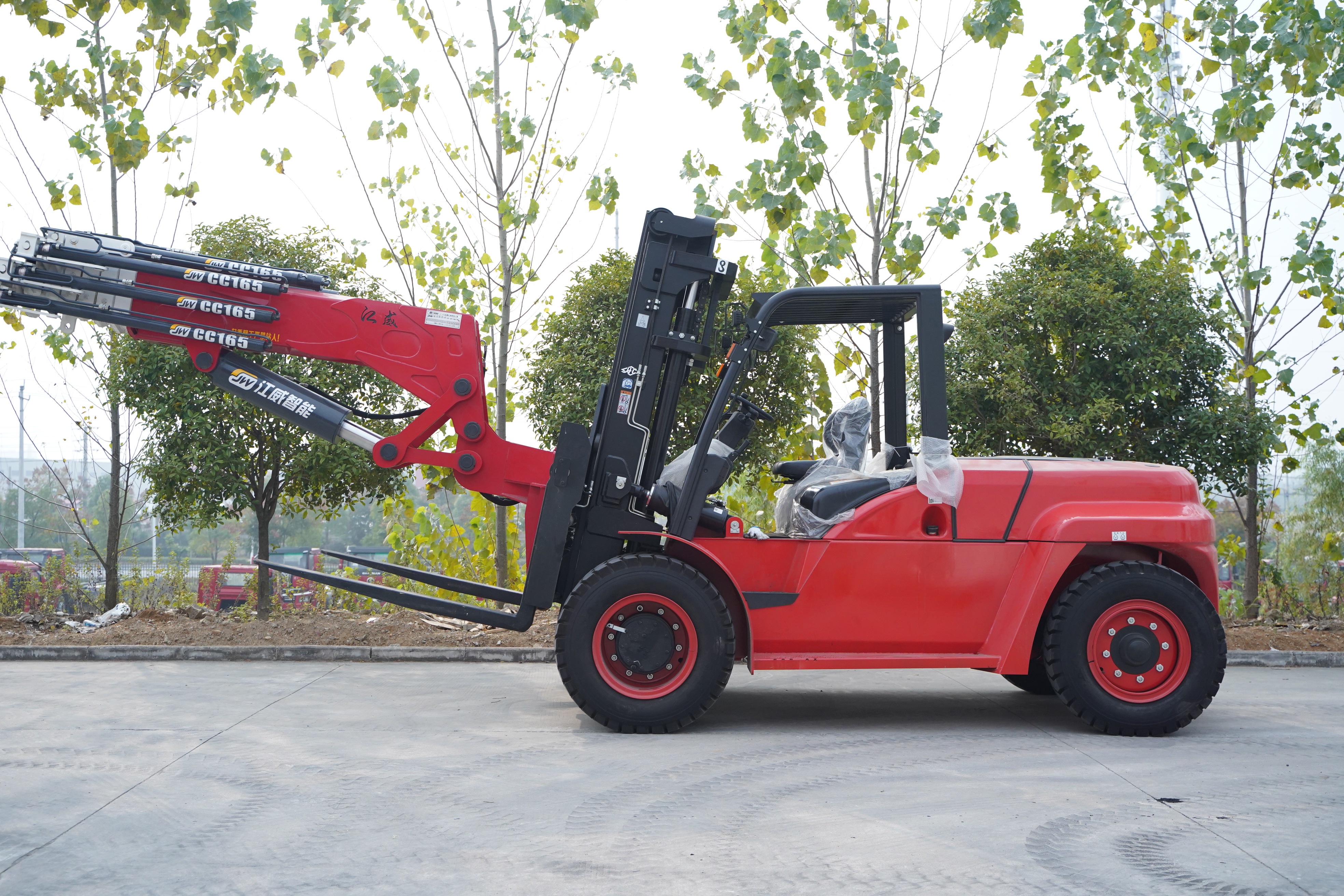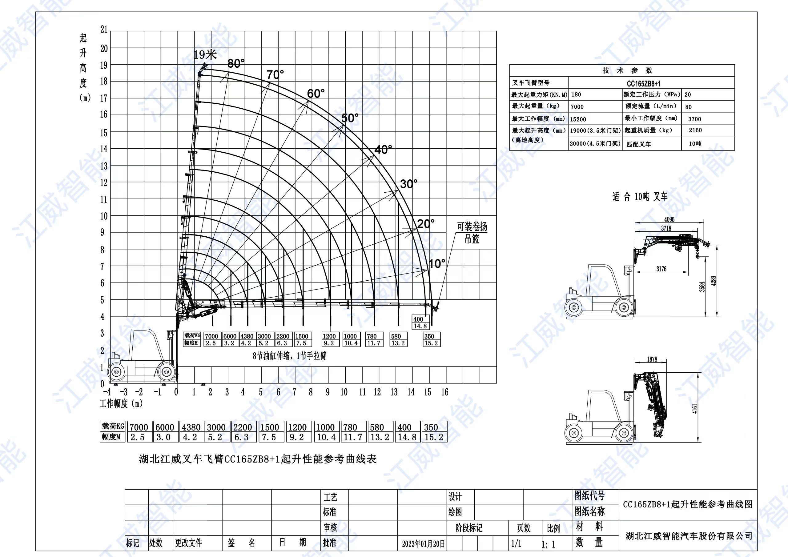江威8噸飛臂吊(CC165),8節(jié)液壓一節(jié)手拉臂帶彎頭副臂,最大工作半徑15.2米,不出臂吊7噸,全部升出吊300多公斤,建議配在7噸或7噸以上的叉車上,配10噸叉車最佳,加叉車門架高度3米最大起升高度18.2米。