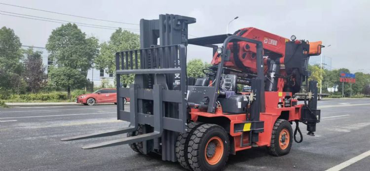 可裝在5噸或5噸以上的叉車上,5節(jié)液壓一節(jié)手拉,帶彎頭副臂,最大工作半徑14.6米。相比前飛臂吊優(yōu)勢:可360度旋轉(zhuǎn),帶5條支腿,4米吊10噸,全部升出吊1.2噸。