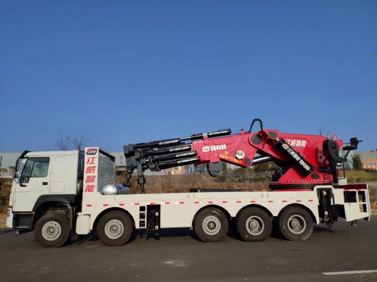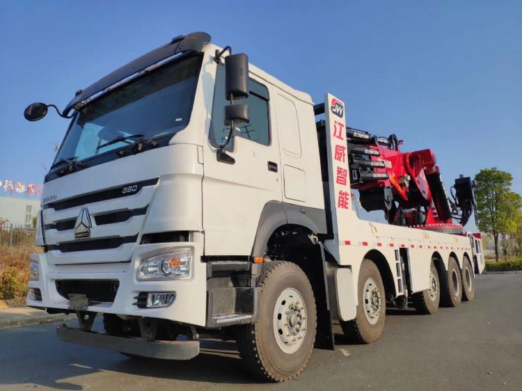 江威100噸折臂吊底盤(pán)配置一:重汽豪沃5軸車底盤(pán),豪沃380馬力發(fā)動(dòng)機(jī),總質(zhì)量50噸,整備質(zhì)量48.8噸,整車長(zhǎng)度12米,1200鋼絲胎,法士特12檔變速箱。