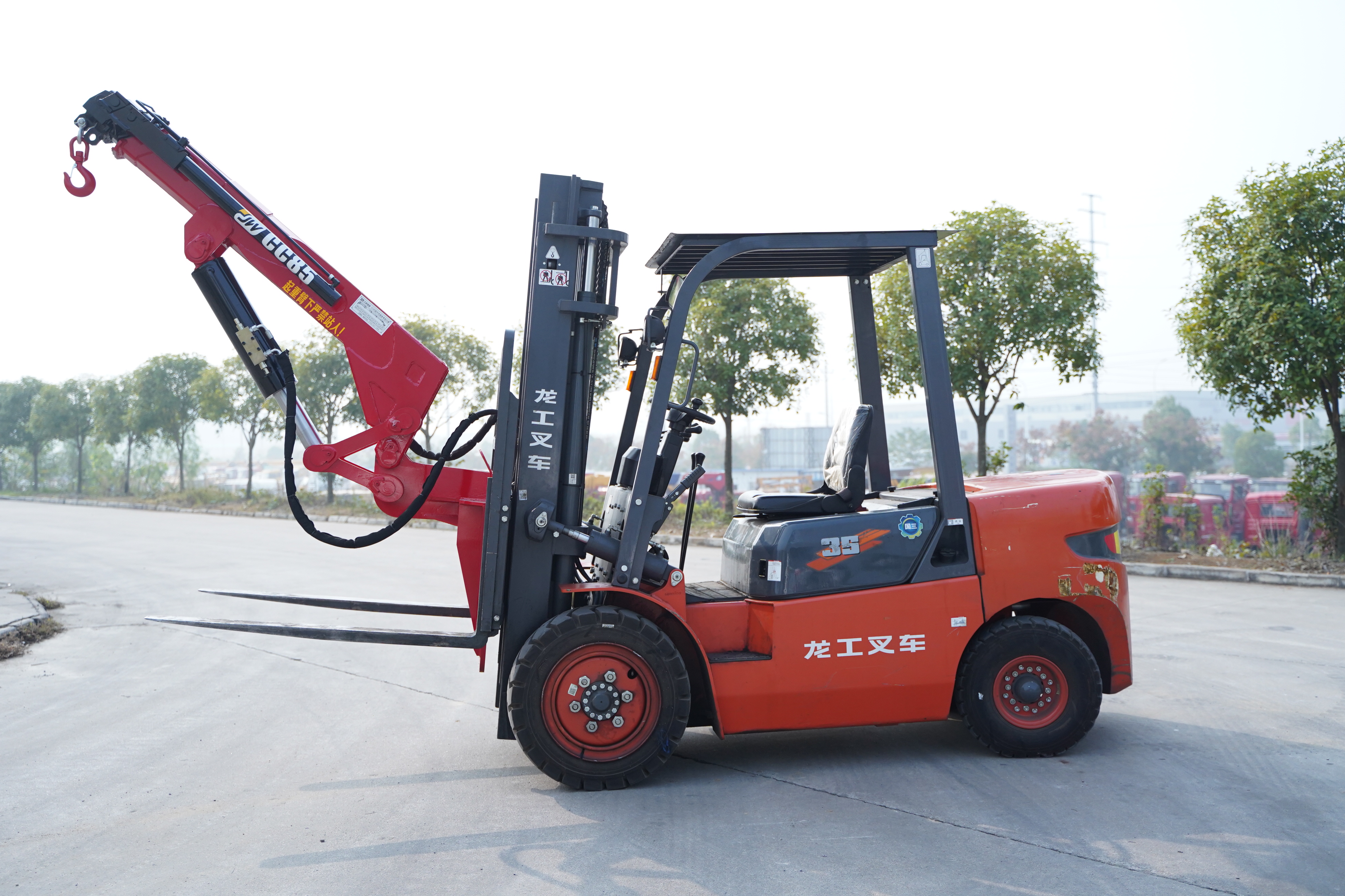 很多地下室限高,吊車進(jìn)不去,一些機(jī)器吊裝,搬運(yùn),就只能用叉車了,配上吊臂,能叉能吊,工作起來(lái)很是得勁兒。